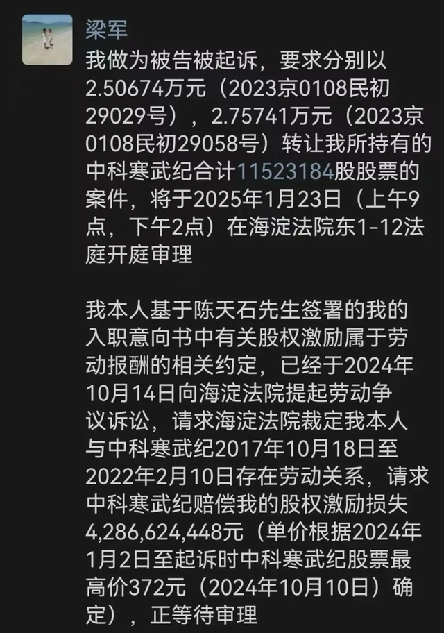 梁军在朋友圈发文中还称,“其已经于 2024 年 10 月 14 日向海淀法院提起劳动争议诉讼,请求海淀法院裁定我本人与中科寒武纪 2017 年 10 月 18 日至 2022 年 2 月 10 日存在劳动关系,请求中科寒武纪赔偿我的股权激励损失约 42.87亿元(单价根据 2024 年 1 月 2 日至起诉时中科寒武纪股票最高价 372 元(2024 年 10 月 10 日)确定),正等待审理。”
